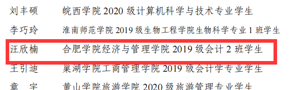 汪欣楠,現任校團委學生兼職副書記、合肥學院第十九屆學生會執行主席。曾獲校級特等獎學金、校級一等獎學金、國元證券獎學金等;曾獲校級“三好學生”“優秀學生干部”“優秀團干”“優秀團員”十余項榮譽;曾獲全國大學生財經素養大賽國家級三等獎、安徽省第五屆校園讀書創作活動二等獎等。2021年作為隊長帶隊赴合肥市廬江縣凌安村參加暑期三下鄉活動,獲全國優秀團隊、合肥學院三下鄉優秀團隊一等獎。