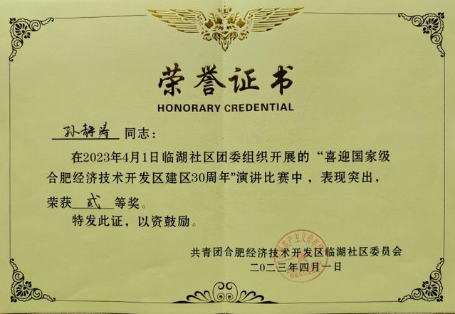 為充分展示經開區新時代青少年的良好精神面貌,進一步激發青春力量立足新起點、開啟新征程,合肥經開區黨政辦、團工委聯合舉辦了經開區30周年演講比賽,我校學子孫靜濤榮獲三等獎。