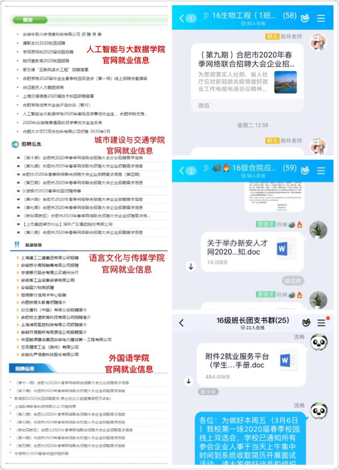 二是采取切實措施,做好網絡招聘。積極開展各類線上招聘活動,發(fā)布了針對企業(yè)疫情期間招聘工作的公告,引導用人單位利用學校和各類網絡招聘平臺開展線上招聘。連續(xù)發(fā)布三個針對疫情期間學校就業(yè)工作安排的通知,要求各二級學校仔細摸排完善“一生一策”就業(yè)方案,有針對性的開展精準信息推送。校就業(yè)指導中心每周開展一場參會企業(yè)規(guī)模在200家左右的線上綜合類招聘會,各二級學院組織開展了專業(yè)性較強的網絡視頻專場宣講會20余場。校就業(yè)網和各二級學院就業(yè)網、校就業(yè)官方QQ、官方微信、校各級就業(yè)QQ群共計宣傳各類省、市、縣區(qū)大中型網絡招聘會20余場,企業(yè)專場宣講會200多家,切實為畢業(yè)生提供了大量高質量的就業(yè)崗位。