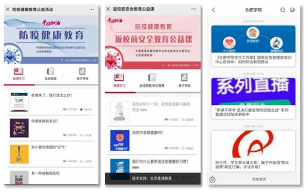學校利用易班網絡平臺實時向師生發布相關信息和相關工作要求,自2020年1月26日起不間斷推送各類疫情防控專題帖20余篇。在易班網上策劃開設“抗擊疫情 易起戰斗  ”主題版塊,在省內高校中率先組織線上“易同戰疫,共克時艱”防疫健康主題教育,及時發布“抗擊疫情,眾志成城,為中國加油!”  全國校園抗擊疫情主題公益歌曲MV征集、“并肩抗‘疫’,你我都在前線!”抗擊疫情主題征稿,積極推送《合肥學院致全校學生的一封信》《萬眾一心,打贏“戰疫”——致全校學生的一封信》,認真組織全體學生參加“全國大學生同上一堂疫情防控思政大課”直播學習,教育引導為學生穿上思想“防護服”,有效凝聚起眾志成城抗擊疫情的強大正能量。