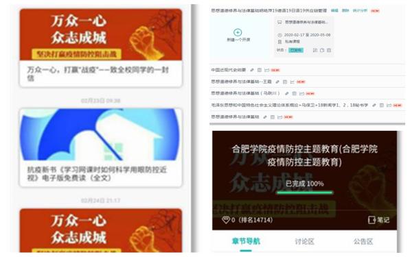 堅決響應教育部“停課不停教、不停學”號召,將思想政治理論課搬進易班,利用易班課群,開展線上教學,目前全校有41  名教師,225個班級,8492名學生進入易班課群學習思政課。發動輔導員們充分利用包括易班在內的網絡平臺,召開線上主題班會,開展防控宣傳教育,將疫情防控知識、愛與感恩教育以及學校的關心慰問傳遞給每一個學生,鼓勵和號召全體合院學子顧全大局、共克時艱。結合易班平臺特點,通過易班優課開展包括防控指南、心理調適、宅家攻略等8個板塊在內的“防疫健康教育”微課學習及在線測試,廣泛宣傳普及防疫知識,增強師生疫情防控認知,累計學習人次超過40000次。