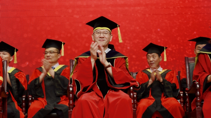 典禮最后,校學位評定委員會全體成員跟現場畢業生代表握手送別。