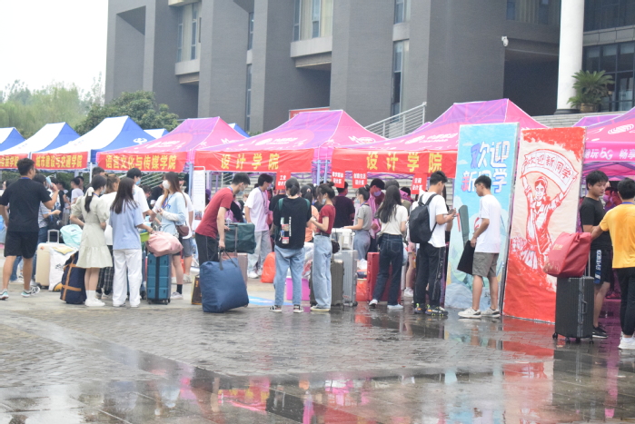 在報到現場,各學院負責迎新的工作人員提前到場做好準備,各學院更是推出了各具特色的展板,傳遞了特有的文化底蘊與精神面貌,構成了一道靚麗的風景線。前來報到的2020級新生在工作人員和志愿者的引導下,佩戴好口罩、間隔1米以上排隊,有序進行口罩更換、行李消毒、體溫檢測、“安康碼”查驗、入校資格核查。進入校園后,新生前往學院報到點報到,辦理相關入學手續并排隊依次領取軍訓服裝,隨后進入宿舍時進行二次核驗并辦理入住手續。