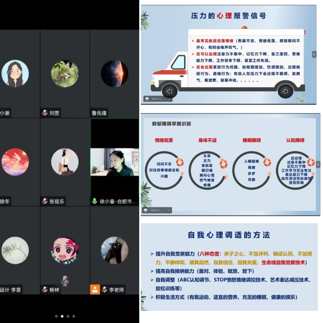 為進一步加強家校聯動和心理健康工作隊伍建設,7月4日晚,學生處邀請了合肥市精神衛(wèi)生防治中心徐小童副主任,面向學生家長和學工隊伍舉辦了以《心理健康促進與情緒自我調試》為主題的線上講座。我校學工隊伍、部分學生家長和學生骨干參加了此次講座,講座由學生處心理健康教育科謝琛主持。