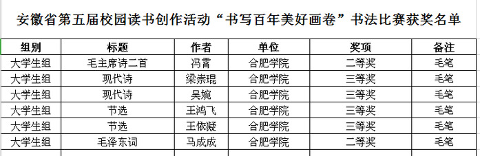 除書畫比賽外,我校學子還參加了安徽省第五屆校園讀書創作活動的其他系列比賽。今后我校將繼續開展讀書創作活動,豐富校園文化生活,營造良好的校園讀書風氣,推進文化育人、活動育人。