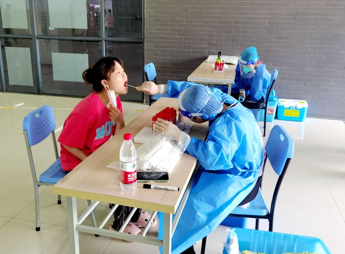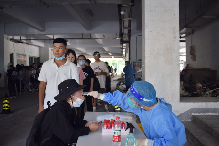 為筑牢校園疫情防線,確保全校師生健康安全,學(xué)校第一時(shí)間組織了全員核酸檢測(cè),要求所有師生返校后按時(shí)完成“三天兩檢”,實(shí)現(xiàn)核酸檢測(cè)全覆蓋。學(xué)校分期設(shè)置兩個(gè)采集點(diǎn)、多個(gè)采集單元,并配有多名志愿者引導(dǎo)核酸檢測(cè)信息采集、維持秩序。受檢學(xué)生及教職工有序進(jìn)入采集點(diǎn),期間全程佩戴口罩且保持安全距離。采樣過程中,醫(yī)務(wù)人員嚴(yán)格按照相關(guān)流程指揮疏導(dǎo)、規(guī)范操作,每采集完一個(gè)樣本,隨即迅速進(jìn)行手部消毒和環(huán)境消毒,確保采樣流程準(zhǔn)確規(guī)范、高效安全。