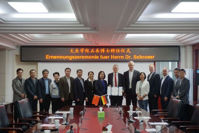 10月8日上午,學校舉行特聘教授聘任儀式,全職聘請大眾集團前高管、工程師石岳博士(Dr. Klaus Schr?er)為大眾學院特聘教授。院長吳春梅,組織部部長白義香,教務處處長、大眾學院院長王曉峰,人事處處長紀平,國際交流合作處處長張慧,大眾學院直屬黨支部書記宣躍文,先進制造工程學院院長胡學友及相關教師出席。大眾安徽首席制造官施耐德博士(Harry Schneider),大眾安徽效率管理總監朱江萍,大眾安徽維修部總監亨德里克·迪普(Hendrik Dippe)受邀出席。儀式由副院長陳秀主持。