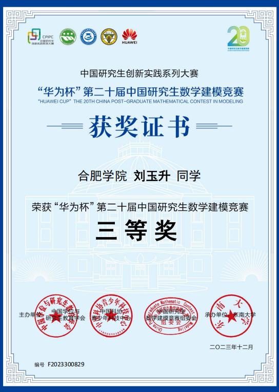 劉玉升始終秉持“以賽促學、以賽促研”的理念,積極參與各類高水平學科競賽,在實踐中不斷拓展學術視野、提升創新能力。在2023華為杯第二十屆中國研究生數學建模競賽中,他帶領團隊克服重重困難,最終榮獲國家三等獎。