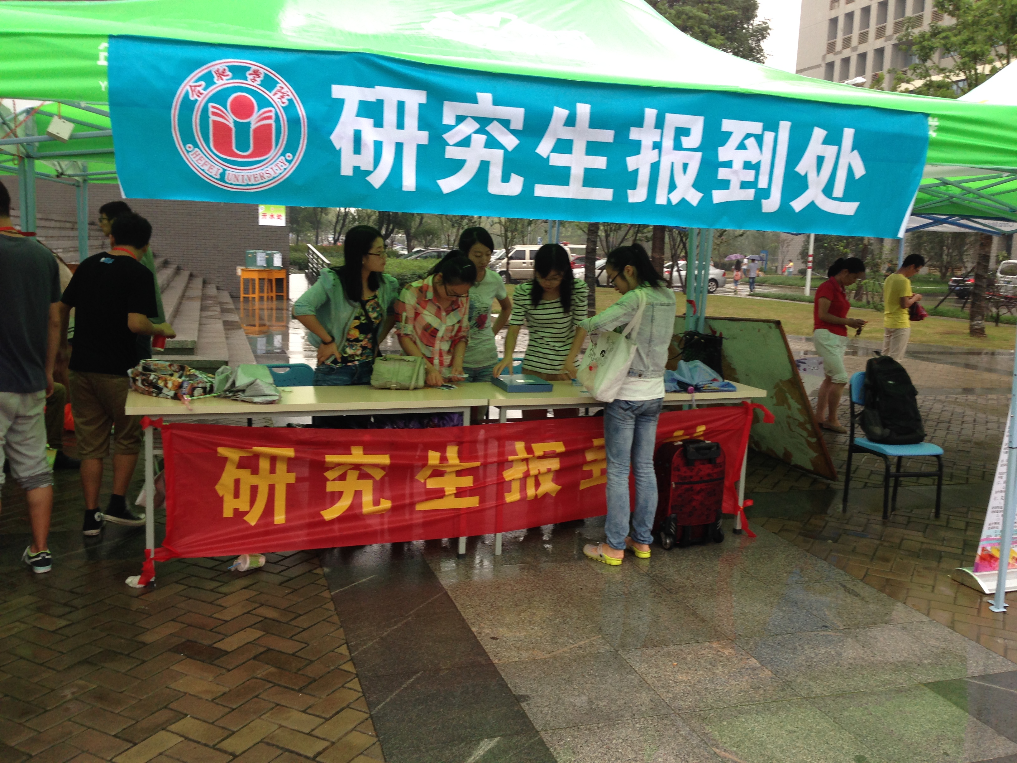 9月10日是我校2014級研究生報到的日子,為迎接新同學的到來,研究生處和生物與環境工程系組織研二、研三的部分同學在圖書館東側搭建起新生臨時報到處,為新生辦理報到手續。院領導蔡敬民書記、張文兵院長、陳嘯副院長和丁明副院長等冒雨親臨研究生報到處,詳細詢問了研究生新生報到情況。盡管天空下起了小雨也阻擋不了同學們前來報到的熱情。今年有24名新同學從省內外不同的大學來到我校攻讀環境工程專業碩士學位,對他們的到來表示熱烈地歡迎。