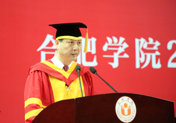 本科生畢業生代表周雷、研究生畢業生代表陸冰潔、留學生代表鄧子明、教師代表楊慶國教授相繼發言。周雷回顧了大學四年的收獲與成長,他表示,會堅定不移聽黨話、跟黨走,增強志氣、骨氣、底氣,不負時代,不負韶華,不負黨和人民的殷切期望,牢記“厚德博學、善思致用”的校訓,在祖國最需要的地方發光發熱。陸冰潔對學校和老師的悉心培養表達了真誠的感謝,她說道:“畢業不是學習的終點,而是新征程的起點,我將會繼續努力,為母校爭光,為社會添彩。”鄧子明在發言中對中國“一帶一路”建設和合肥學院的國際教育合作為他提供求學機會,以及學校、老師和同學對他的關懷幫助表示衷心的感謝。在合肥學院,他收獲了青春記憶,獲得了前進動力。楊慶國在發言中勉勵畢業生永存至真至義、當立鴻鵠之志、再續輝煌征程。他提到:“士不可以不弘毅,任重而道遠,希望同學們志存高遠,為了‘躺贏’,絕不‘躺平’。”