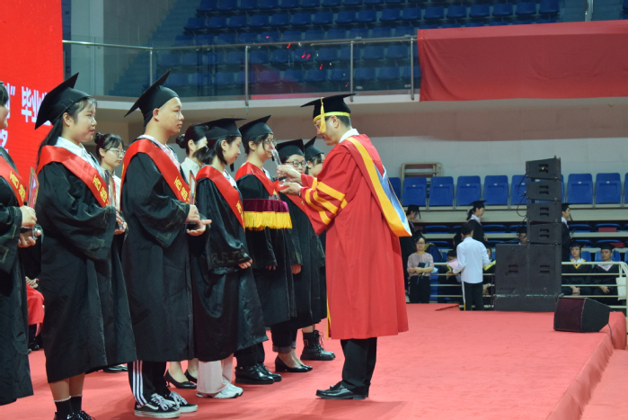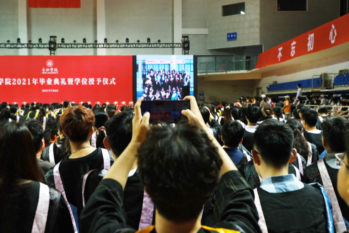 畢業典禮盛大落幕后,各學院分別在二期體育館A館、學術報告廳A廳舉行2021屆畢業生學位授予儀式,為畢業生撥穗、頒授學位并合影留念。