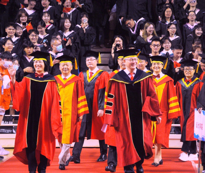 校學位評定委員會全體成員入場后,2021屆畢業典禮在莊嚴的國歌聲中拉開帷幕。