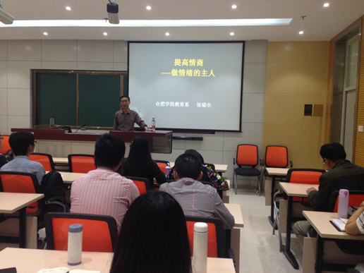 2015年5月13日上午10時,合肥學院大學生成長與發展指導中心主任、安徽省心理學會常務理事、中國筆跡分析學會秘書長張福全教授為同學們作了一場題為“提高情商——做情緒的主人”的講座。張教授主要從“什么是情緒”、“什么是情商”和“如何提高情商及控制個人情緒”三個方面為同學們作了精彩的闡述。張教授用生動的語言、原創的案例和富有哲理的比喻對心理學、心理健康的有關問題進行了精彩的解讀和闡釋,面對心理壓力,他提出自我調控技巧六法:音樂放松、運動放松、體閑放松、冥想放松、催眠放松等,積極倡導過體現生命價值的有趣、有愛、有希望的生活。
