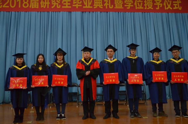 隨后,丁海濤代表2018屆全體畢業生向指導、培養、關心和幫助他們的領導、校內外導師表達了誠摯的謝意,真情的言語里流露出對母校的依依惜別之情。他提到,在兩年半的學習中,他們開拓了視野,提高了專業知識水平并培養了實踐動手能力和解決實際問題的工程能力。丁海濤表示,在今后的工作中,一定將自己學到的知識應用到社會實踐中,服務社會,以優異的工作成果來回饋母校的培養。導師代表胡坤宏教授祝賀同學們獲得碩士學位,他為在兩年半的學習中同學們的進步感到無比驕傲,并希望同學們今后繼續努力,踏實工作,為母校爭光。接著,紀平宣讀了“關于表彰合肥學院2018屆碩士研究優秀畢業生、優秀畢業論文和‘合大環保獎學金’獲得者的決定”,并由紀平、肖厚榮和安徽合大環境檢測有限公司總經理韓蔚分別為優秀畢業生和“合大環保獎學金”獲得者頒獎。