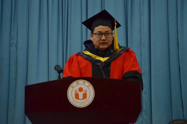 畢業典禮在莊嚴的國歌聲中開始。伍德勤宣讀了“關于授予2018屆環境工程領域謝紅燕等24名研究生工程碩士學位的決定”。在熱烈的掌聲中,劉建中代表我校,向順利畢業的2018屆畢業生表示熱烈的祝賀,向校內外導師以及支持我校研究生教育的所有機構和人員致以衷心的感謝。他還在致辭中回顧了我校教育改革所取得的成績以及研究生教育改革的成就,同時也向即將開始人生新起點的同學們提出“追求卓越,成就自我”的殷切希望和在未來的人生道路上要“創新思想、志存高遠勤奮努力、主宰未來;常懷感恩、尊重友情”的建議。