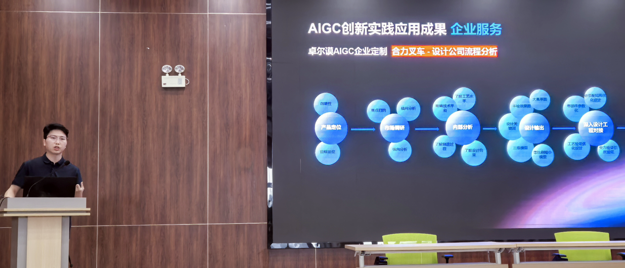 卓爾謨科技有限公司創始人沈應龍先生也進行了分享。他表示AIGC技術已在智能汽車、智能家居、消費電子等多個行業落地應用,并指出AI在整個設計流程中都發揮著關鍵作用。此外還介紹了一系列有助于設計的軟件,如即夢、Chat GPT 、Midjourney等。