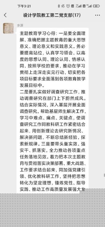 研討會第二環(huán)節(jié)支部黨員針對合實際圍繞“三問”(過去學得怎么樣、現在干得怎么樣、將來打算怎么辦)展開了線上交流研討。黨員教師在支部微信群積極展開研討,深入剖析過去、現在、未來的工作和學習。