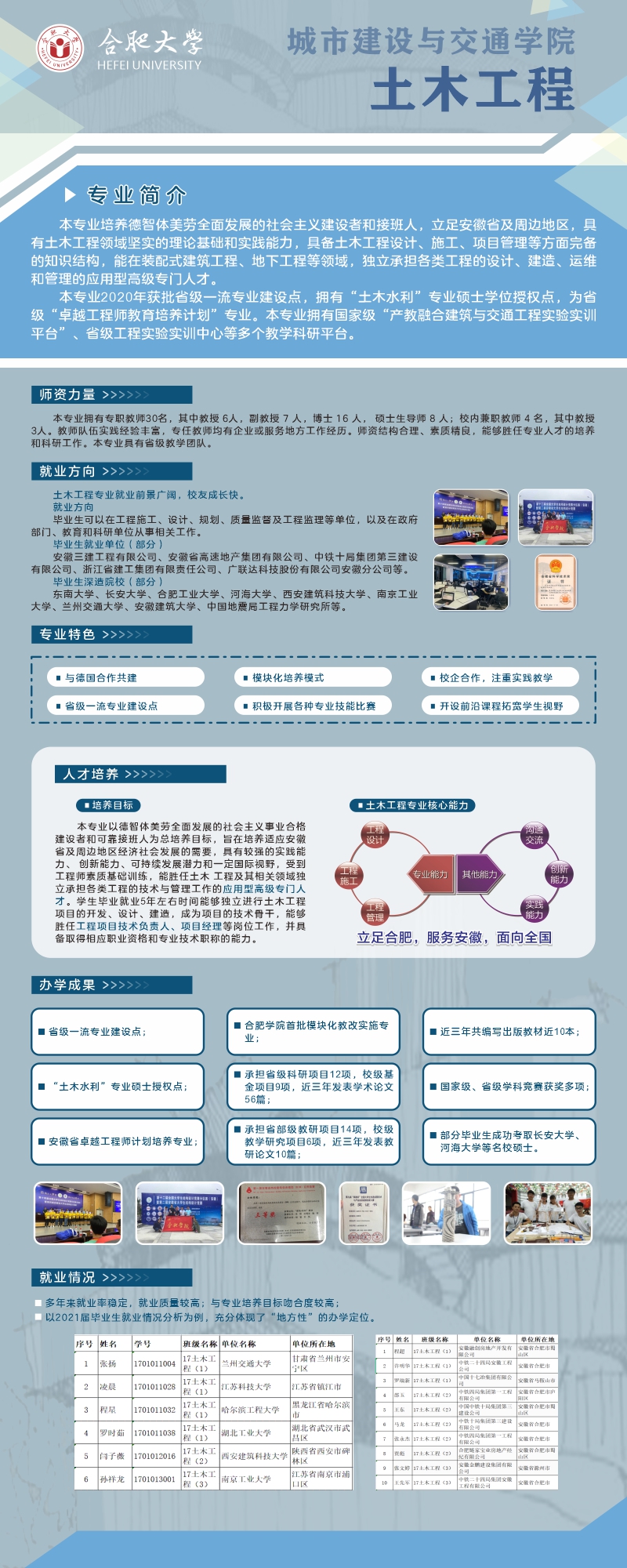 培養目標及特色:本專業培養德、智、體、美、勞全面發展的社會主義事業建設者和接班人,立足安徽省及周邊地區,具有土木工程領域堅實的理論基礎和實踐能力,具備土木工程設計、施工、項目管理等方面完備的知識結構,能在裝配式建筑工程、地下空間等領域,獨立承擔各類工程的設計、建造、運維和管理的應用型高級專門人才。借鑒德國應用型人才培養模式,落實“模塊化”教育教學改革;探索“雙元制”高等教育新模式,對標行業標準,推進新工科建設;組建現代產業學院,形成產教融合協同育人模式。