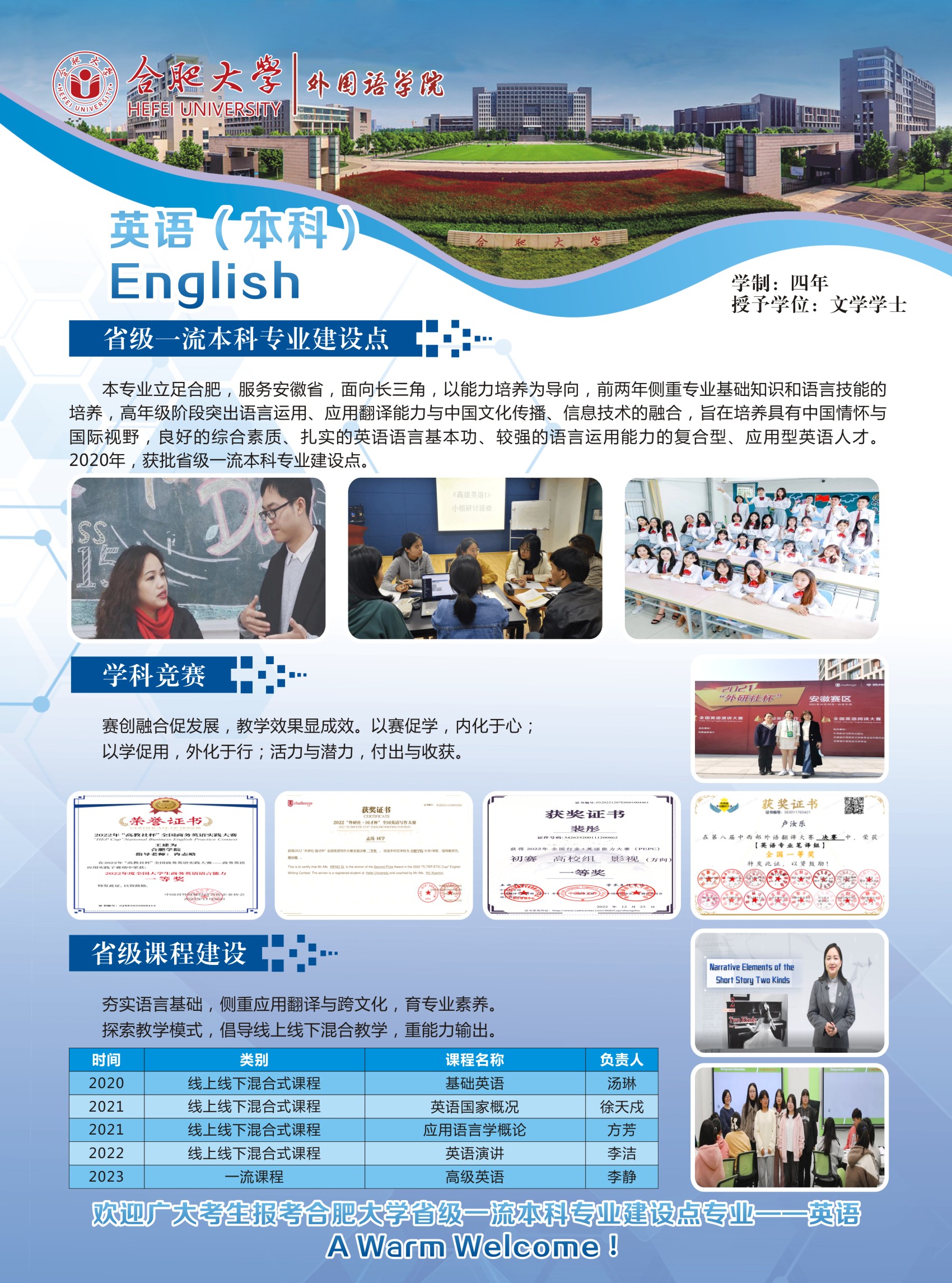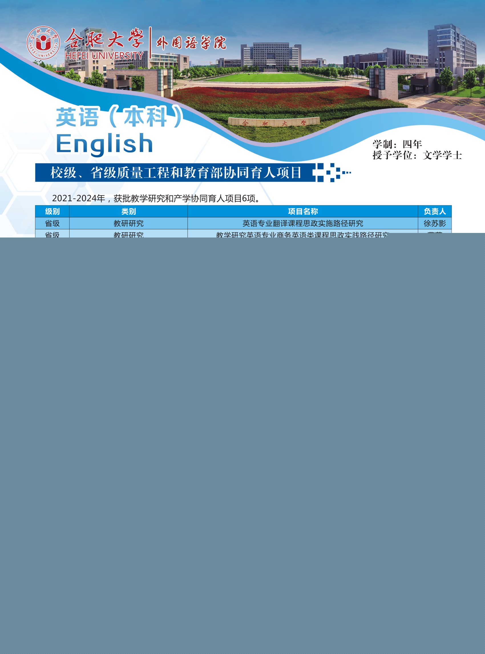 培養目標及特色:本專業培養德、智、體、美、勞全面發展,具有良好的綜合素質、扎實的英語語言基本功、較強的語言運用能力和應用翻譯能力、厚實的英語專業知識和必要的英語教育或商務英語專業知識與技能,能適應安徽、合肥與環巢湖地區區域經濟一體化發展和對外宣傳需要,可熟練使用英語從事涉外行業、語言服務行業和英語教育教學等項目管理、應用翻譯、教學等相關工作的具有較高跨文化傳播能力的復合型、應用型英語人才。本專業注重自主學習平臺建設,打造分層次的集中實踐和課內實踐教學體系,開拓應用能力培養的課內外輸出路徑,提升了學生講述中國故事、安徽和合肥外宣話語的寫作、演講、翻譯和闡釋能力。