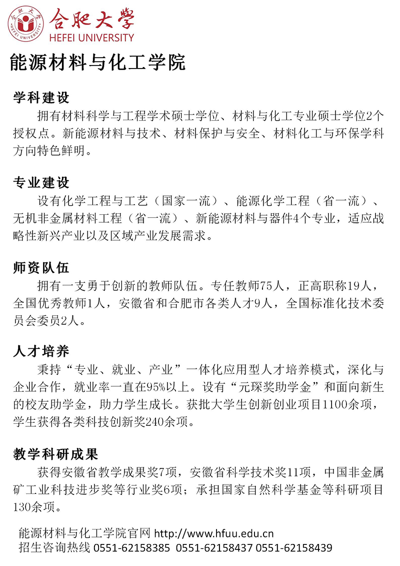 能源材料與化工學院現有化學工程與工藝(國家級一流本科專業建設點)、能源化學工程(省級一流本科專業建設點)、無機非金屬材料工程(省級一流本科專業建設點)、新能源材料與器件4個本科專業。學院建有安徽省綠色涂料高性能助劑工程研究中心、高端裝備摩擦副安徽省重點實驗室、先進電池關鍵材料與技術重點實驗室,以及化工工程師之家等16個科技創新平臺和實驗室。新能源材料與技術、材料保護與安全、材料化工與環保等研究方向特色鮮明。學院擁有一支勇于創新的教師隊伍。現有專任教師79人,其中正高職稱23人,副高職稱24人,包含2023年度入選全球前2%頂尖科學家“年度影響力”榜單2人,全國優秀教師1人,安徽省百人計劃、安徽省五一勞動獎章,安徽省優秀教師和合肥市各類人才9人。學院與大眾(安徽)、元琛科技、國軒高科等企業開展深度合作,構建了“專業、就業、產業”一體化融合發展的高質量應用型創新人才培養模式。學生得到用人單位的一致肯定,就業率一直在95%以上。