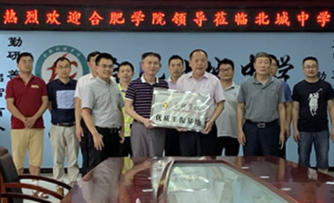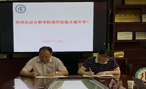 2020年5月28日,合肥學院—合肥北城中學(合肥一中北城校區)“優質生源基地”簽約授牌儀式在合肥北城中學行政樓會議室舉行。合肥學院人工智能與大數據學院院長檀明、數學與統計系主任王磊、副主任牛勇、行政助理劉艷,合肥北城中學校長王東錄、副校長王克成、校長助理賀東旭、年級部主任尹連輝,北城中學各年級部代表等領導出席會議。會議由合肥北城中學校長王東錄主持。