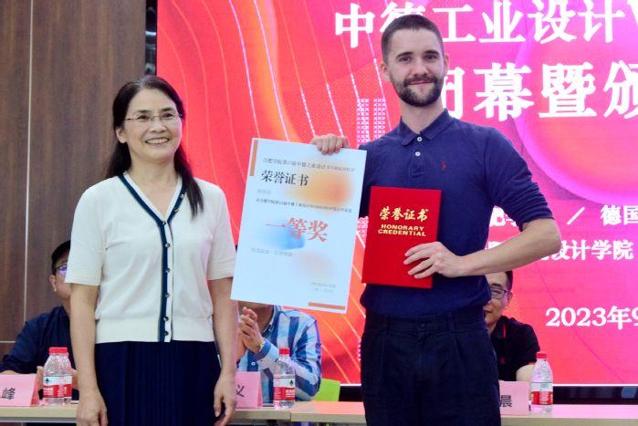 德國漢諾威應(yīng)用科學(xué)大學(xué)學(xué)生菲利克斯·格魯博與合肥學(xué)院設(shè)計(jì)學(xué)院學(xué)生王鴻飛作為學(xué)生代表發(fā)言。安徽合力股份有限公司工業(yè)設(shè)計(jì)項(xiàng)目經(jīng)理尚正海和法爾克·霍恩教授對活動進(jìn)行了回顧和點(diǎn)評。