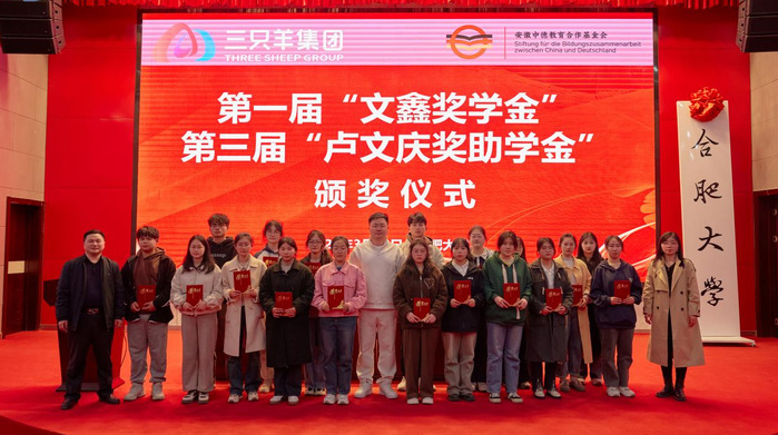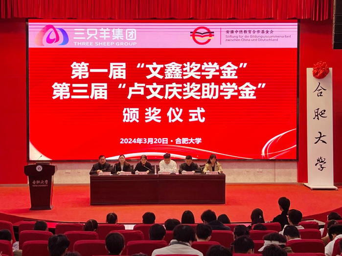 3月20日下午,第一屆“文鑫獎學金”和第三屆“盧文慶獎助學金”頒獎儀式在我校圖書館報告廳A廳舉行。三只羊集團創始人兼董事盧文慶,我校副校長、安徽中德教育合作基金會理事長陳秀出席儀式,基金會辦公室主任劉金平,人工智能與大數據學院院長余海峰,人工智能與大數據學院黨委副書記、紀委書記姚蓓蓓,相關負責老師及獲獎助學生等參加儀式。儀式由基金會秘書長何世昆主持。