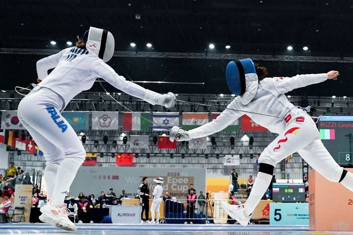 南京站比賽是巴黎奧運會女子重劍項目的最后一站積分賽,此次團體賽共有18支隊伍參賽,中國隊沉著應戰、頑強拼搏、默契配合,最終以45:43戰勝韓國。