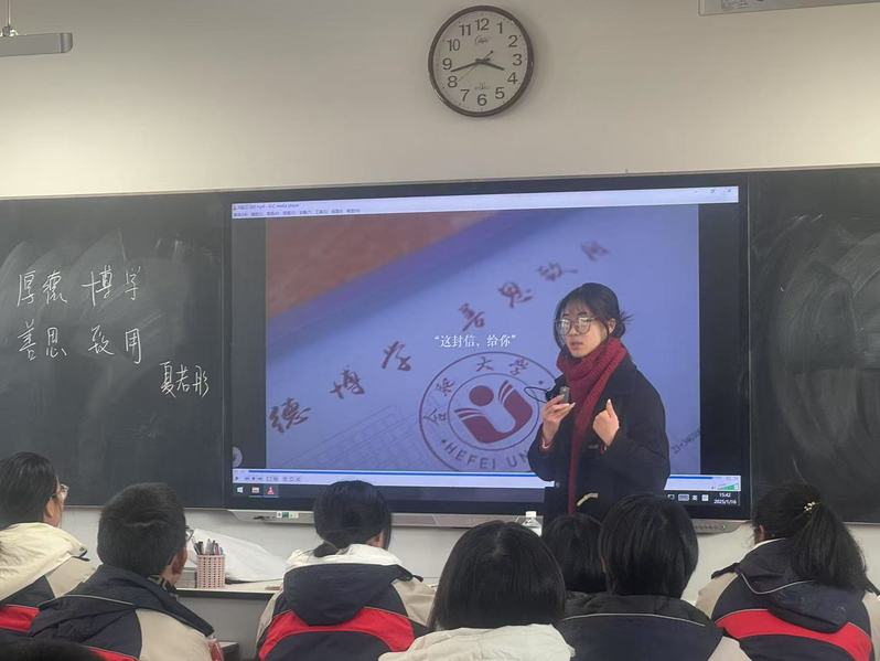 本次活動涉及合肥一中、合肥六中、合肥168中學等省內外28所中學,影響了近千位高中學生。來自24級新聞1班的夏若彤返回母校阜陽紅星中學,她以介紹合肥大學的特色與優勢為核心,向同學們展示了大學生活的魅力,詳細講解了學校的專業設置和課程安排,特別是一些特色專業和同學們感興趣的熱門專業。同時還分享了豐富多彩的校園活動,包括社團、體育賽事、學科競賽和志愿服務等內容,展現了大學生活的多元化。在宣講過程中,夏若彤積極與高中生們積極互動,耐心回答他們提出的關于大學生活、學習規劃等方面的問題,并結合自身經歷分享了經驗。
