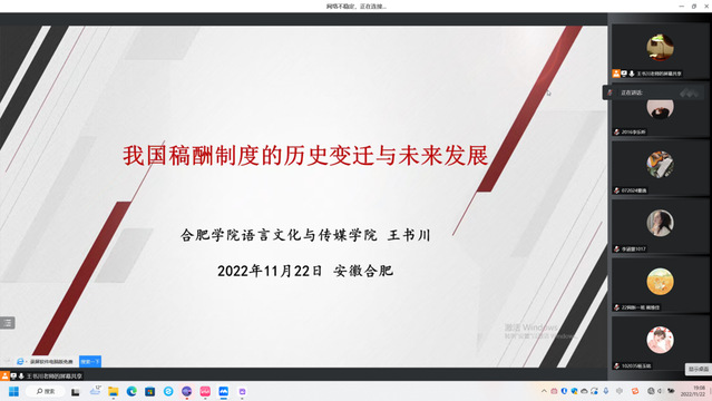 20221122日晚7點,語言文化與傳媒學院舉辦了一場主題為“我國稿酬制度的歷史變遷與未來發展”的學術講座。講座在騰訊會議線上進行,由語言文化與傳媒學院青年教師王書川主講,22級新聞學、22級網絡與新媒體兩個專業共146名學生參加。